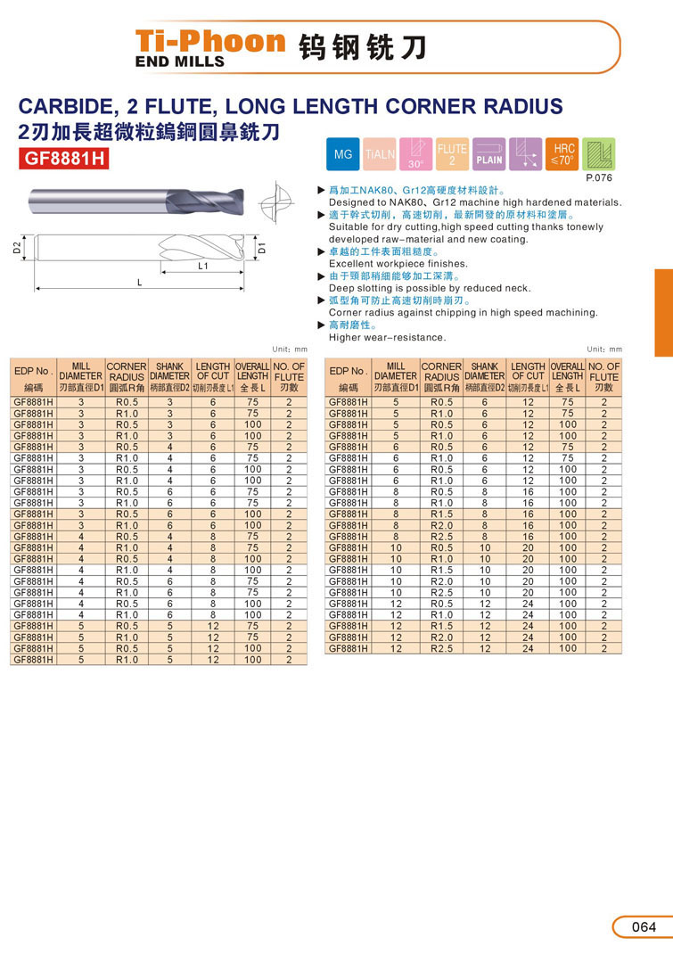 2刃加長(zhǎng)超微粒圓鼻鎢鋼立銑刀064