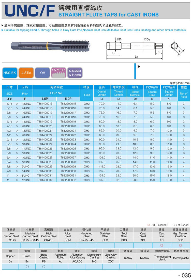 美制鑄鐵直槽機用絲攻032