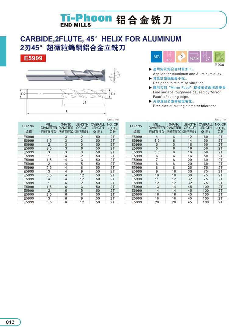 1. 2刃鋁合金銑刀 013