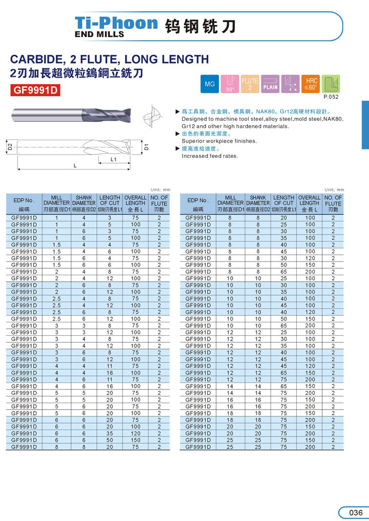 2. 2刃加長超微粒鎢鋼立銑刀036